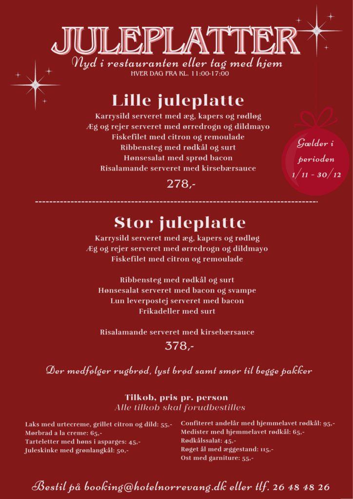 Hos os kan I vælge mellem den klassiske julemenu, lækre vegetariske alternativer – eller vi skræddersyr en løsning, der passer præcis til jer.