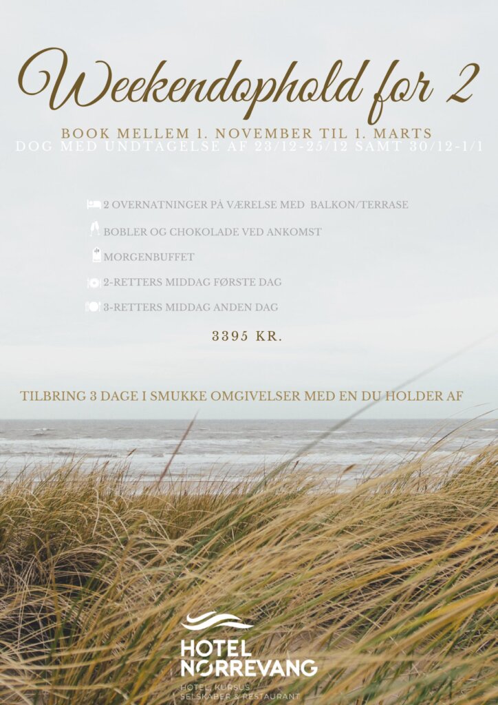 Uanset om du ønsker en romantisk weekend, en aktiv ferie med vennerne eller et stilfuldt forretningsophold, har vi den rette pakke til dig. Vores weekendophold inkluderer lækre måltider på Restaurant Nørrevang, og vi sørger for, at dit ophold bliver helt specielt.